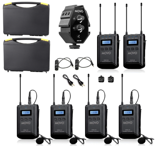 | Description: | Movo 8-Channel UHF Wireless Lavalier Microphone System Bundle W/ 2-Channel Mixer, 2x Receivers, 4x Transmitters & 4x Lapel Microphones | |||