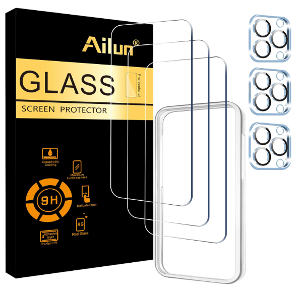 | Description: | Ailun Tempered Glass Screen Protector w/ Camera Lense Protectors for 6.7" iPhone 15 Pro Max, 3-Pack | |||