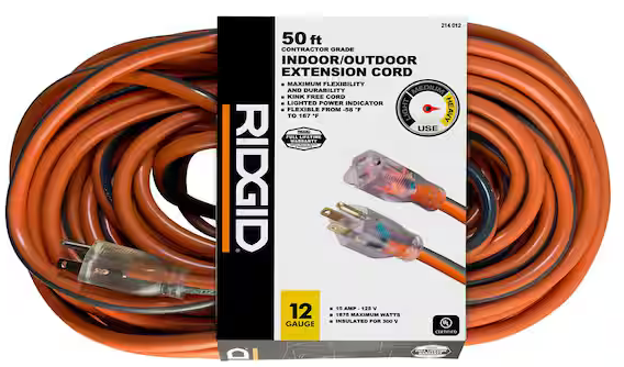 | Description: | Ridgid 12/3 Heavy Duty Indoor/Outdoor Extension Cord W/ Lighted End, Orange / Grey, 50ft | |||