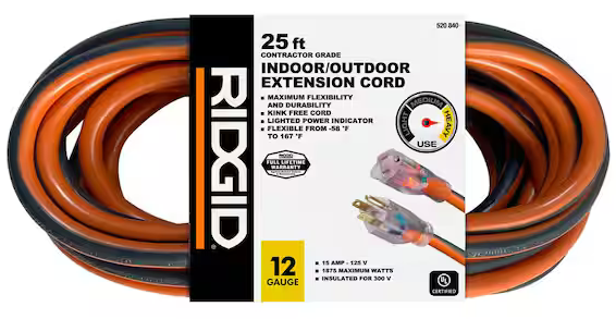 | Description: | Ridgid 12/3 Heavy Duty Indoor/Outdoor Extension Cord W/ Lighted End, Orange / Grey, 25ft | |||