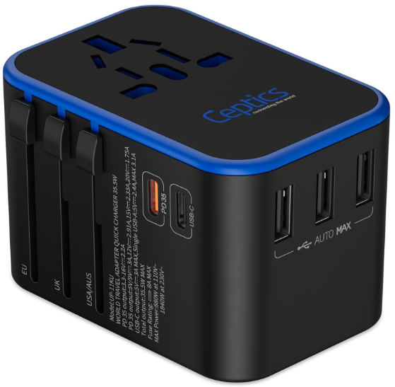 | Description: | Ceptics All-In-One International Travel Adapter Plug W/ 2x USB-C (PD & QC) Ports & 3x USB Ports | |||