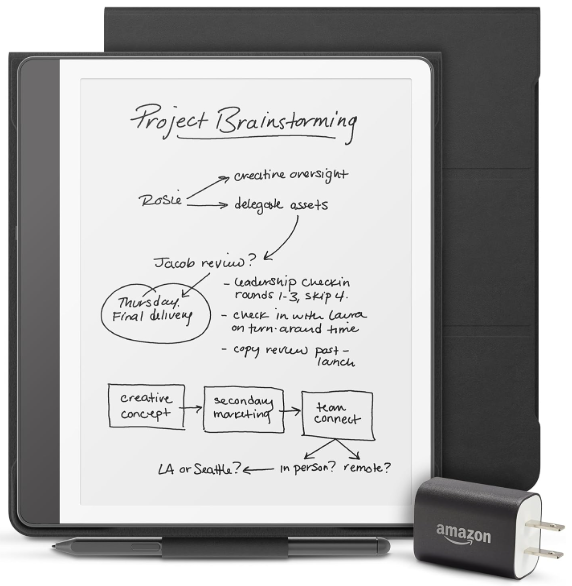 | Description: | Amazon Kindle Scribe Essentials Bundle W/ Kindle Scribe 64GB, Tungsten Premium Pen, Premium Leather Folio - Black & Power Adapter | |||