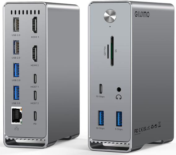 | Description: | Giissmo 14-in-2 MacBook Pro Docking Station, Dual Monitor USB-C W/ Dual 4K HDMI 60Hz, 10Gbps, RJ45, Audio, SD/TF Slots, 87W PD | |||