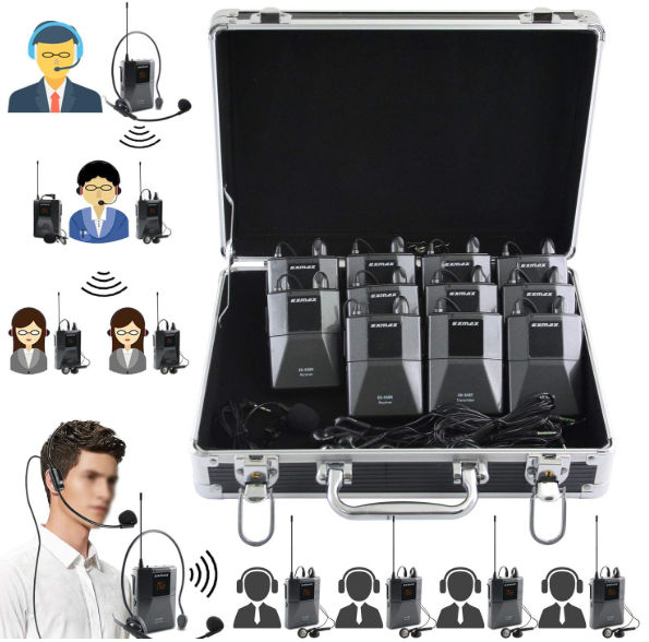 | Description: | EXMAX Wireless Headset Mirophone Interpreter Translator System W/ 1x Transmitter, 10x Receivers & 1x Storage Case | |||