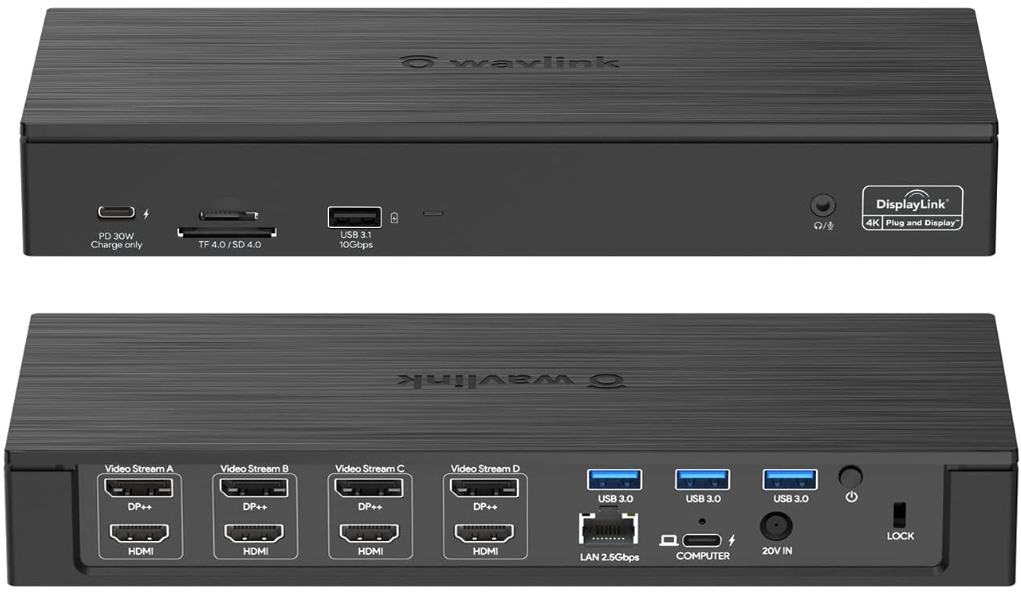 Description:WavLink DisplayLink Laptop Docking Station, Quad Monitor 5K/4K@60Hz, 100W Charging & Thunderbolt 4/3, USB-C/A