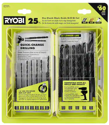 Description:Ryobi 25-Piece Hex Shank Black Oxide Drill Bit Set