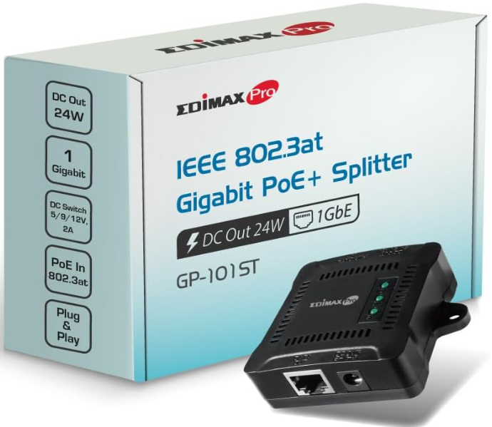 Description:Edimax Pro Compact Gigabit PoE+ Splitter W/ Adjustable 5/9/12V X 2A Output Array