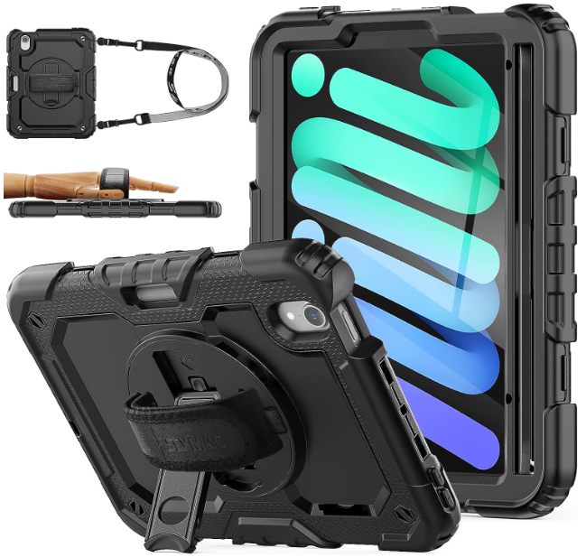 Description:Seymac 8.3" Drop-Proof Case W/ Screen Protector, Pencil Holder, 360-Degree Rotating Hand Strap & Stand For IPad Mini 6th Generation, Black