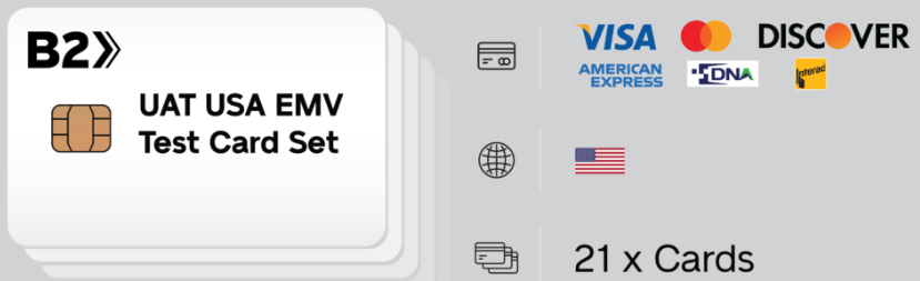 | Description: | B2 UAT USA EMV Test Card Set, 21 Cards | |||