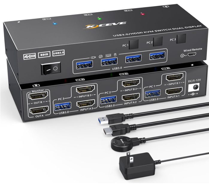 | Description: | AooCoo Dual Monitor 3 In 2 Out USB 3.0 HDMI KVM Switch W/ 4xc USB 3.0 Ports, Wired Remote & Cables | |||