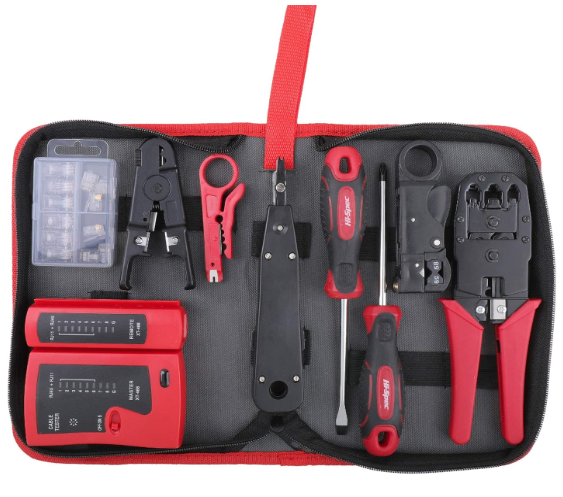 | Description: | Hi-Spec 9pc Network Cable Tester Tool Kit Set For CAT5, CAT6, RJ11, RJ45. Ethernet LAN Crimper, Punchdown, Coax Strippe | |||