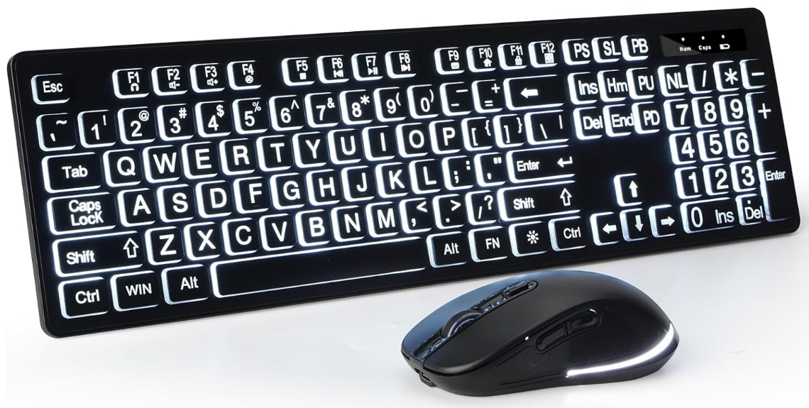 | Description: | Kopjoppom Large Print Backlit Quiet USB Wireless Full Size Keyboard W/ White Illuminatied LED Lights, Black | |||