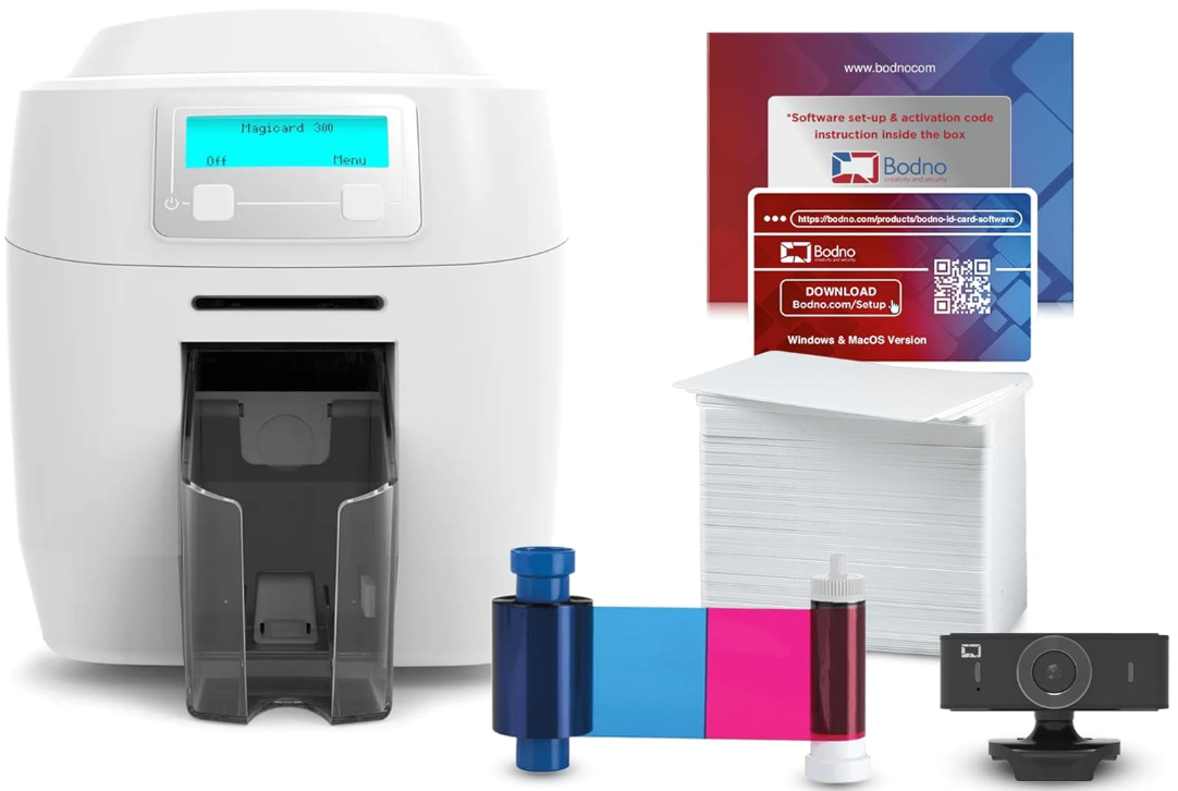 | Description: | Bodno Magicard 300 Dual Sided ID Card Printer & Complete Supplies Package ID Software, Bronze Edition | |||
